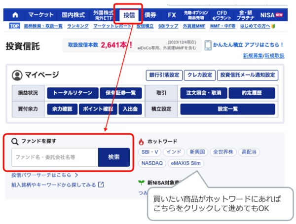 「投信」をクリック→「ファンドを探す」で投資したい商品を検索します。