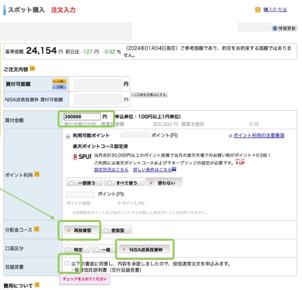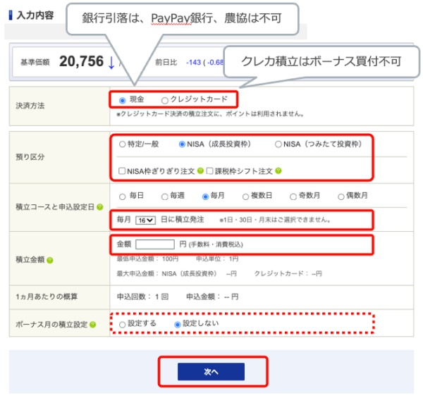 (月後半で設定すると、当月分の買付と見なされない場合もあります。)