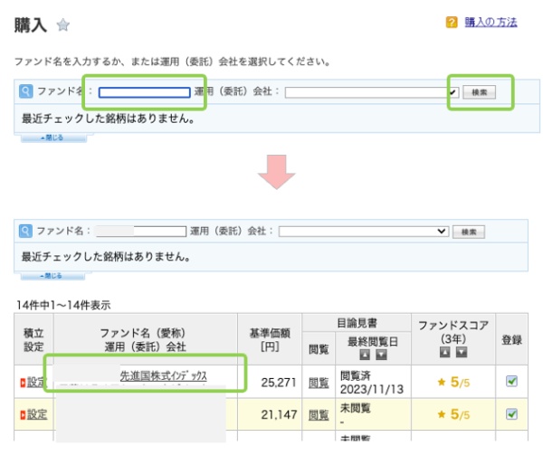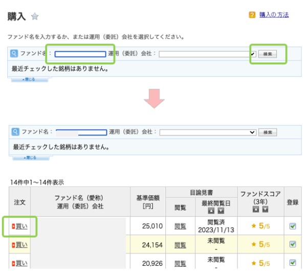 買いたい商品の「ファンド名」をクリックします。